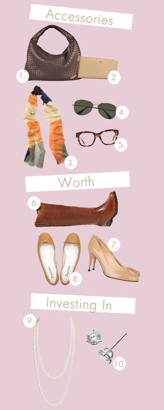 9. A long strand of pearls – maybe when I’m older I’ll want a really pretty strand of short pearls, but for now, a super long strand is a classic essential that instantly glams up any outfit in a non-offensive obnoxious way. Sure big chunky statement necklaces are great, but for the times and occasions when subtlety is called for, nothing is better suited for that than simple long pears, wrapped several times around your neck. Here’s how I wear my long strand (which I picked up at a garage sale for 50 cents! One day I’ll buy the ones pictured from Nordstrom. I’ve wanted this strand for at the last 5 years).