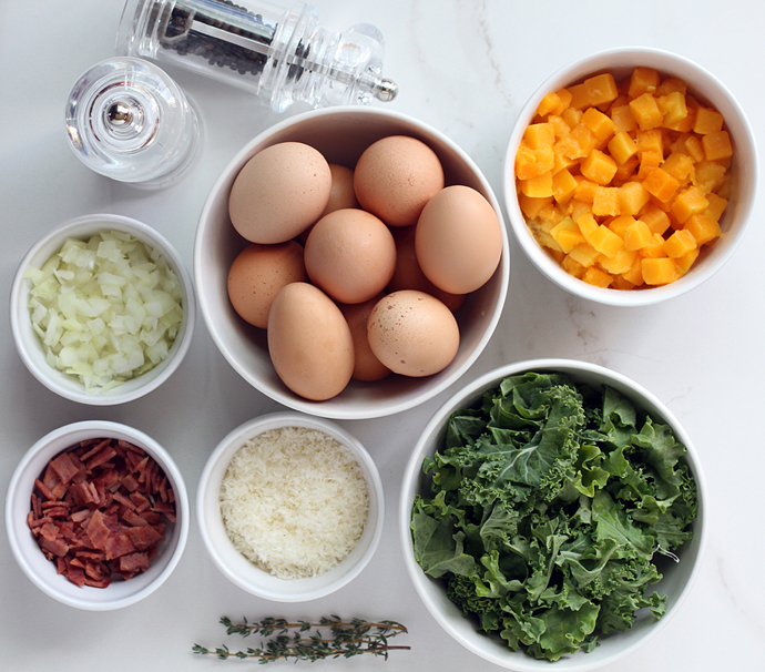 This butternut squash and kale frittata is an easy, yet impressive dish to make, and transports and stores well. My version included turkey bacon, but feel free to leave it out, and switch up the veggies. Actually, just about any veggie will do, but I love the transitional flavor combination here; perfect to bridge the gap between winter and spring.